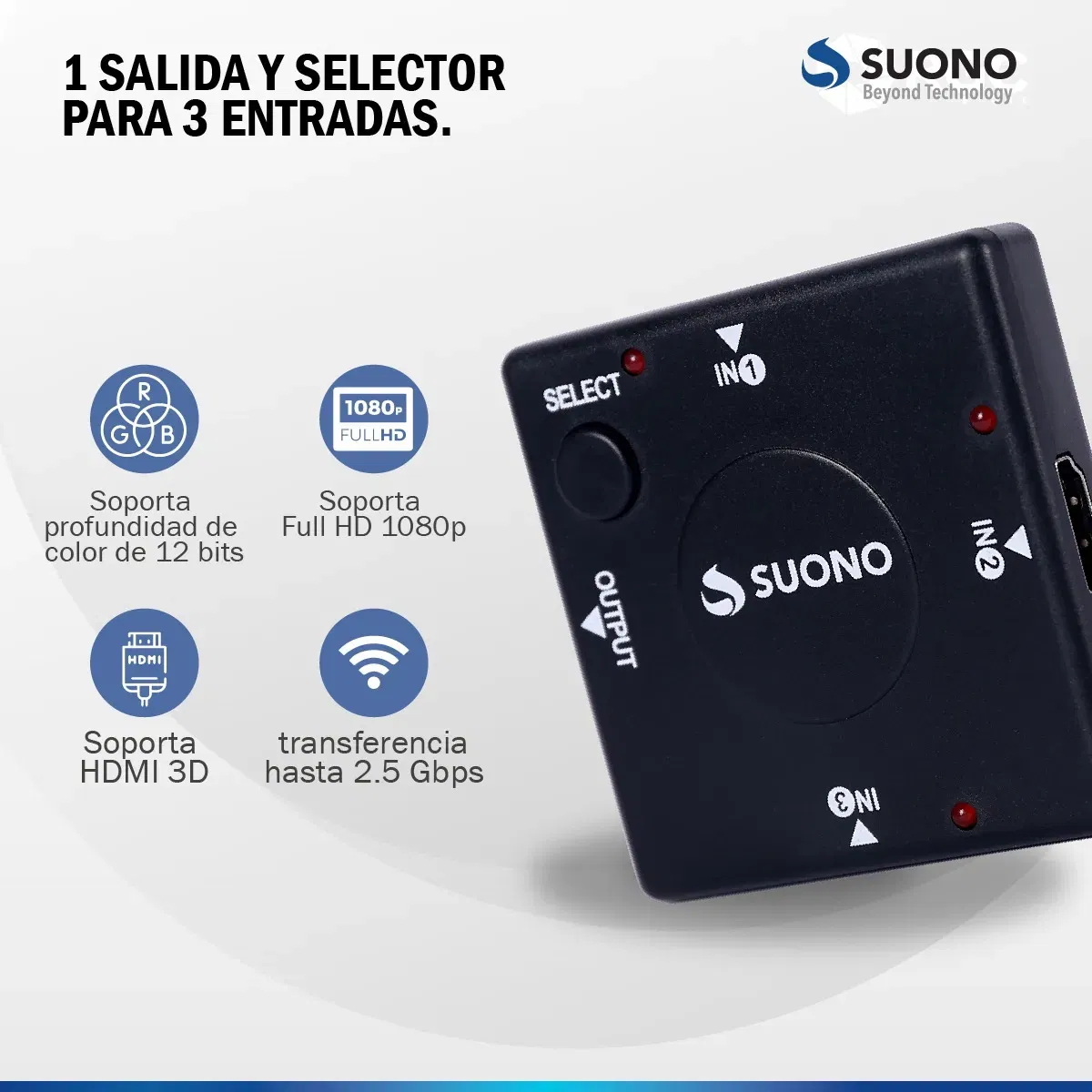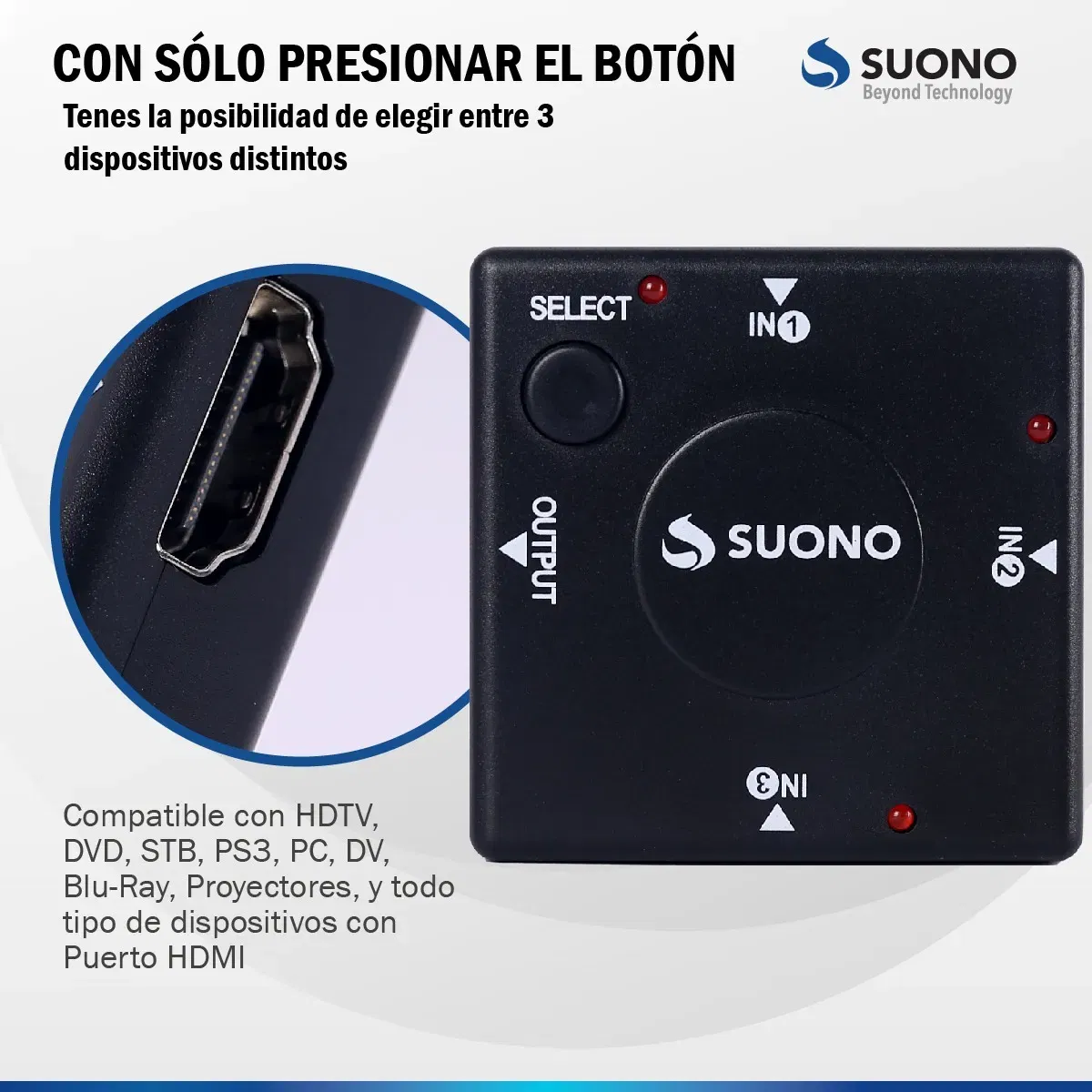 HDMI-SW3 es un adaptador con 1 salida y un selector para 3 entradas que permite la conexión de múltiples dispositivos como consolas de videojuegos, reproductores Blu-Ray o PC a un solo puerto HDMI de tu TV o monitor. Al presionar el botón de selección, puedes elegir entre los dispositivos conectados.